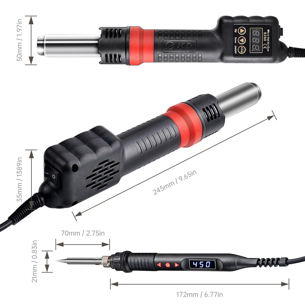 Brand: JCDWeight: 875gSpecifications: L245*W50*H35 mmVoltage: AC220-240V / AC100-130VFrequency: 50Hz / 60HzOutput Power: 750WTemperature Range: 100°C to 480°CTemperature Stability: ±2°CAirflow: 15...